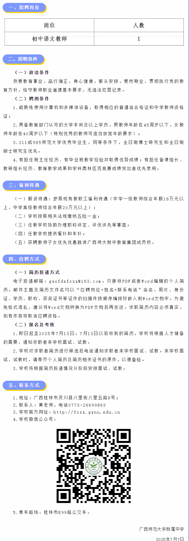 原文標題:廣西師范大學附屬中學面向全國急聘初中語文教師1名