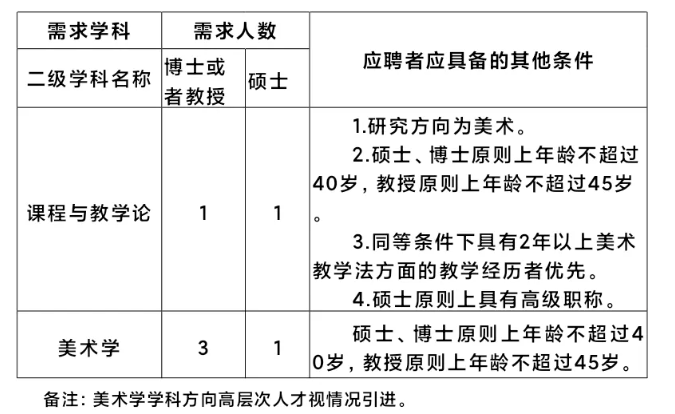 美術學院2025年計劃在美術學、課程與教學論(美術)等專業方向招聘6位專任教師,其中計劃招聘博士或者教授4人,碩士2人。