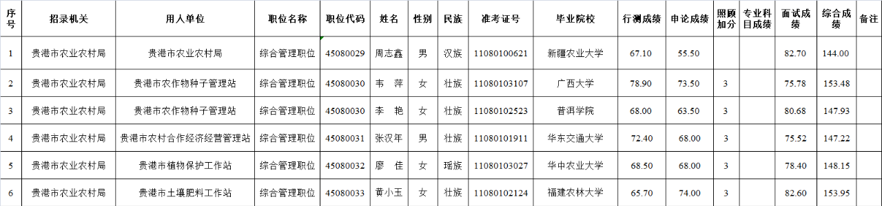 6.6 貴港市農業農村局2025年度考試錄用公務員擬錄用人員名單