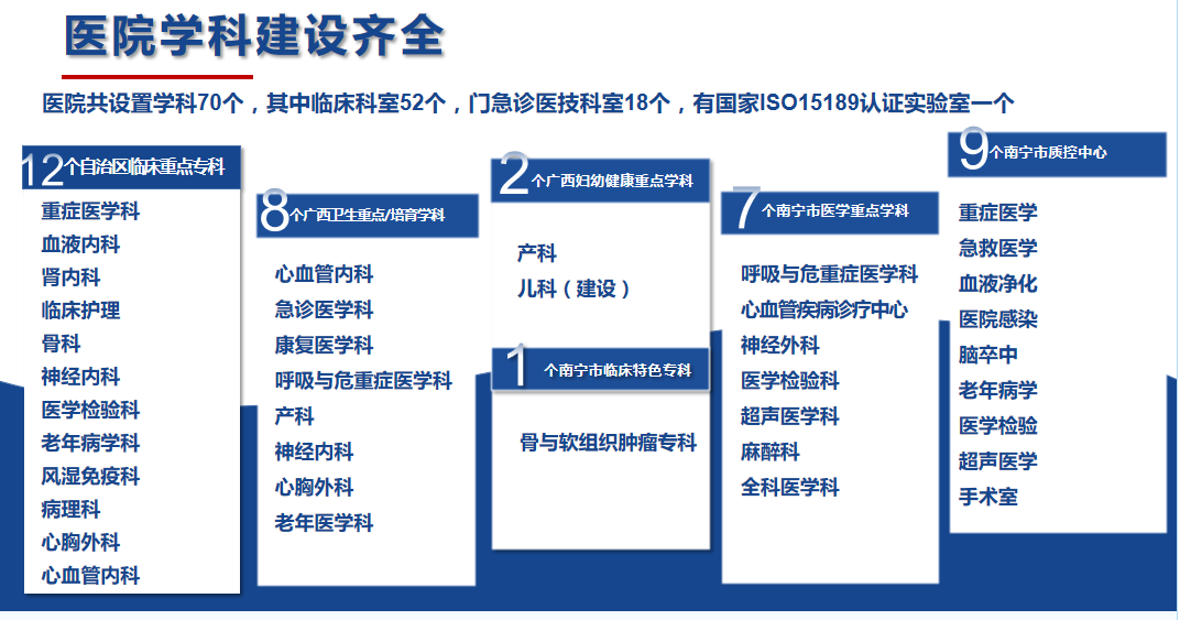 南寧市第一人民醫院(南寧市兒童先天性心血管疾病研究所、南寧市呼吸道疾病研究所、廣西醫科大學第五臨床醫學院、廣西醫科大學第五附屬醫院)始建于1914年,是一家擁有百年歷史的國家三級甲等綜合性醫院。醫院設有52個臨床病區,18個門診醫技科室,總開放床位1912張(含分院)。醫院是國家高級認知中心建設單位及國家神經介入建設中心、國家ISO15189醫學檢驗認證機構,國家聯盟中心認證的胸痛中心、卒中中心;擁有廣西臨床重點專科(含培育)12個、自治區醫療衛生重點學科(含培育)8個、自治區婦幼健康服務重點學科(含建設)2個、南寧市醫學重點學科7個、南寧市臨床特色優勢專科1個,南寧市質控中心9個。醫院是國家衛健委創面修復能力建設和繼續教育中心教學基地、國家級住院醫師規范化培訓培訓基地,廣西醫科大學碩士研究生培養基地,同時是暨南大學共建醫學教育基地、第十批廣西博士后創新實踐基地;醫院還具備國家藥物臨床試驗機構資質(含I期研究室);醫院醫學實驗中心獲批廣西科技廳重點實驗室“廣西智慧精準醫學實驗室”,是南寧市衛健系統唯一的省級重點建設實驗室。2019年在市委市政府支持下,成立南寧市第一人民醫院醫療集團。現有27家成員單位,形成“1+4+22”(中心醫院+4家二級醫院+22家基層衛生及養老機構)一體化格局,推行“三二一”運營管理模式,逐步構建全生命周期健康管理鏈。