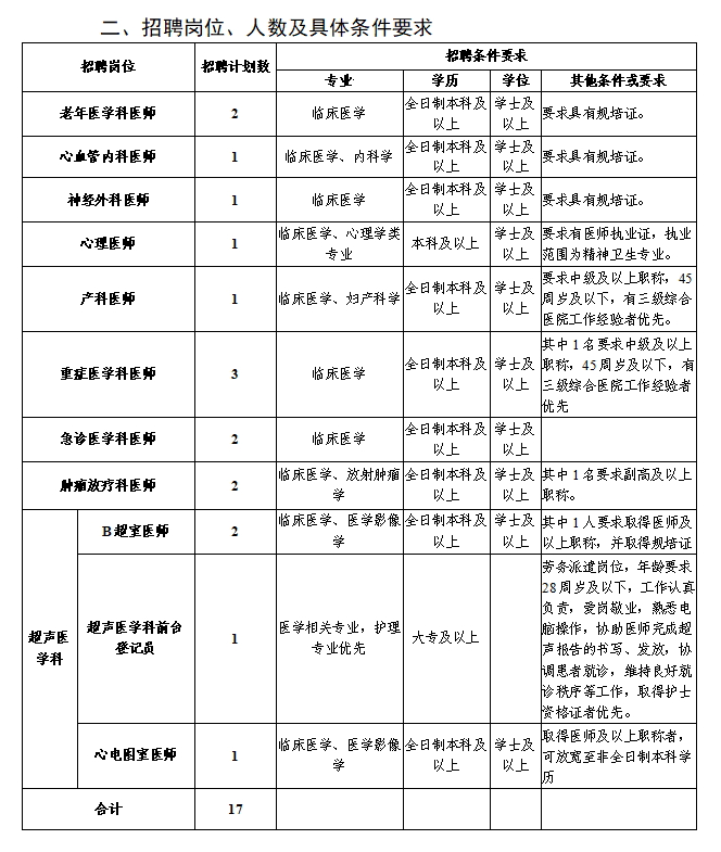 注:初中級職稱應聘人員原則上年齡要求為35周歲及以下;如為副高以上職稱,年齡可放寬至45周歲;學歷層次高者優先。醫師崗位中如要求具有規培證條件的是指已取得規培合格證書(含通過規培結業考試未領合格證書)或已取得中級及以上職稱人員。