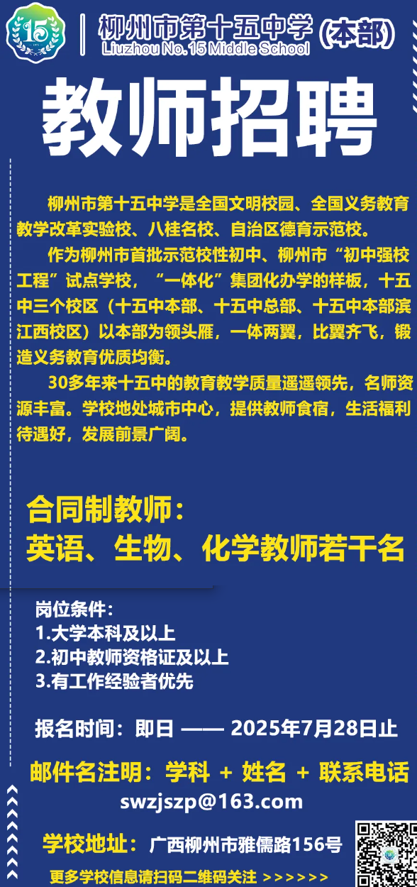 原文標(biāo)題:柳州市第十五中學(xué)本部誠聘英才