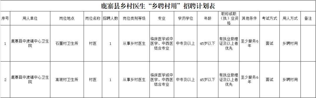 因工作需要,我院擬向社會公開招聘鄉村醫生2名,現將有關招聘事項公告如下: