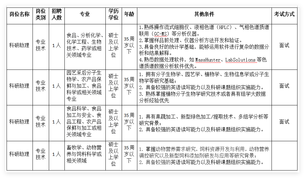 廣西農業科學院農產品加工研究所農產品保鮮與物流研究室主要研究廣西特色果蔬等采后品質形成和成熟衰老規律,開發農產品采后生理及調控技術,研制物流保鮮新材料、新產品,利用果蔬加工副產物開發高值化新產品。根據學科建設與團隊發展需要,現面向社會公開招聘科研助理(編制外工作人員)4名。有關事項公告如下: