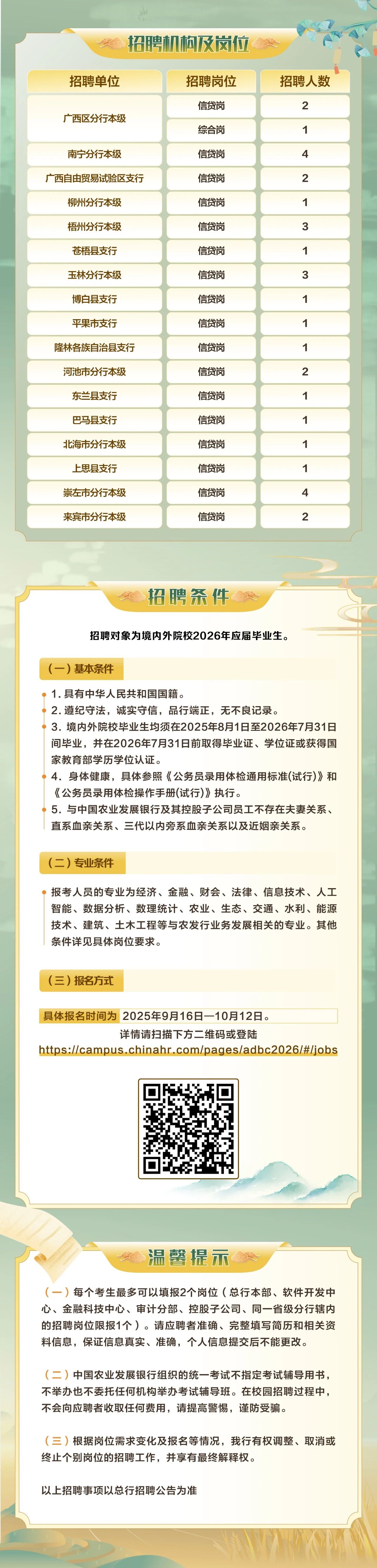 原文標題:中國農業發展銀行廣西區分行2026年校園招聘正式啟動