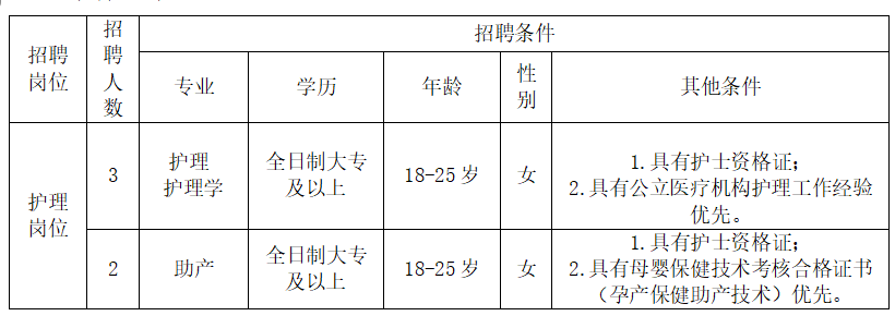 本次公開招聘護(hù)理崗位工作人員5名,具體招聘崗位、人數(shù)、資格條件如下: