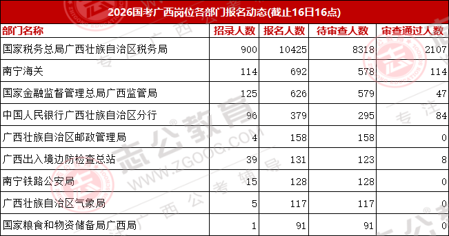 國考報名第二天,不少同學還處在觀望狀態。目前報名人數前三的部門依次為:國家稅務總局廣西壯族自治區稅務局,報名人數10425人;南寧海關,報名人數692人;國家金融管理總局廣西監管局,報名人數626人;這三個部門的報考總人數達11743人,報考熱度高度集中。