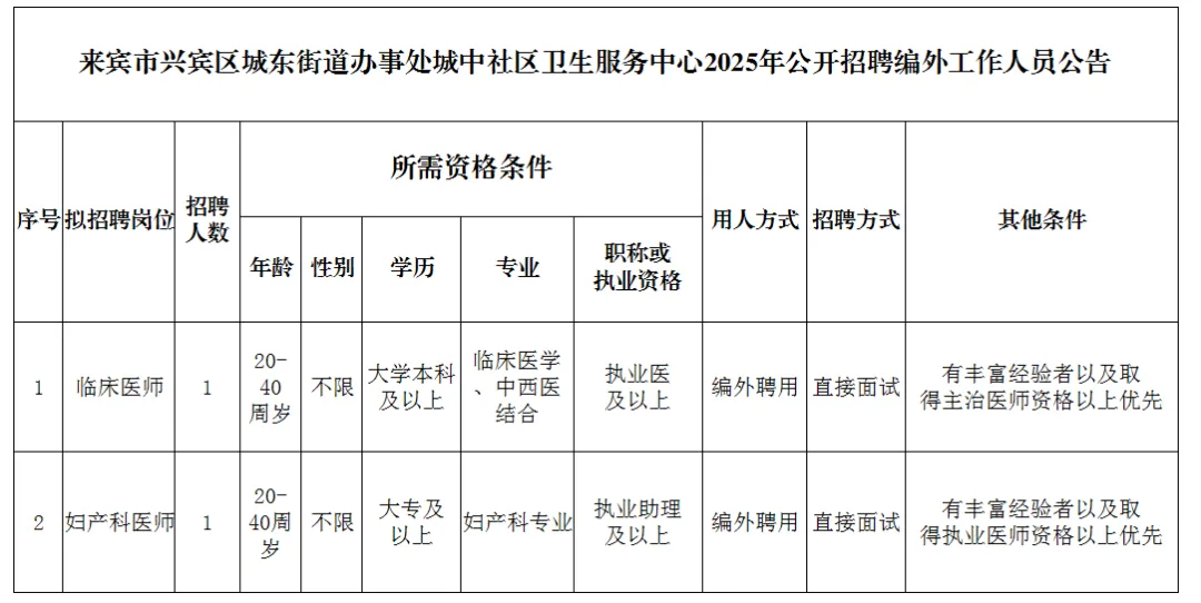 2025年來賓市興賓區城中社區衛生服務中心公開招聘編外工作人員公告