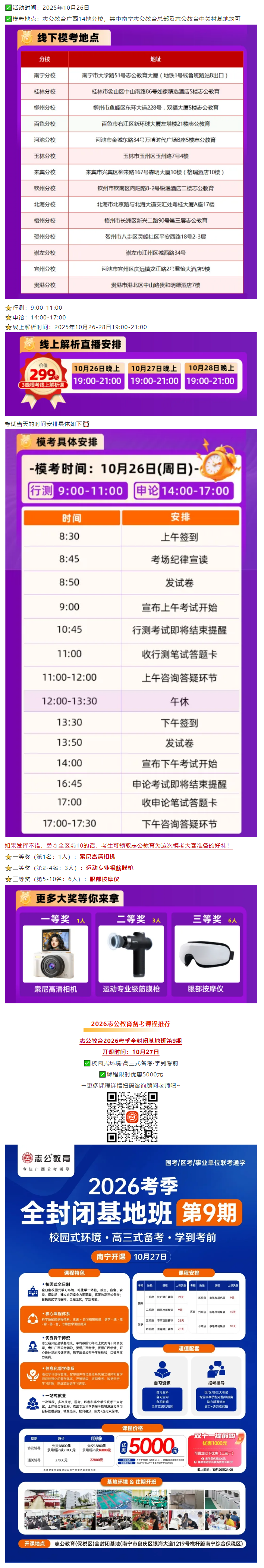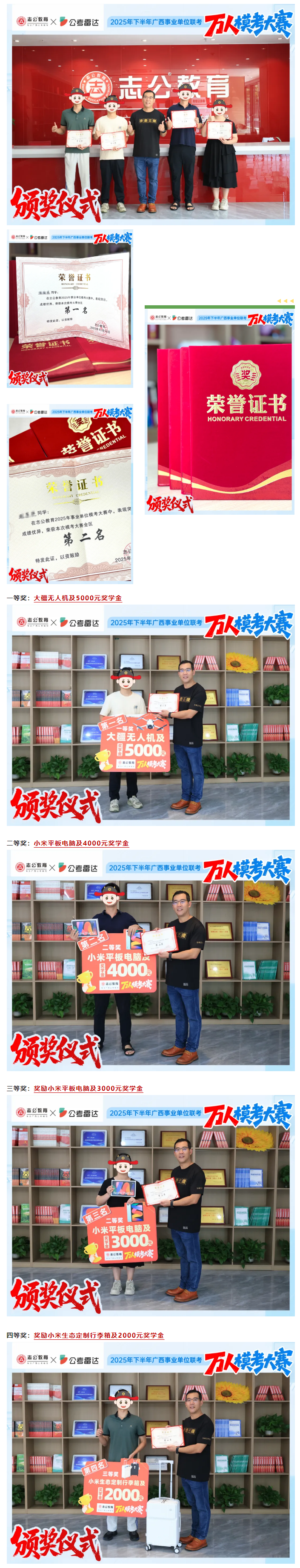 模考大賽的價值不止于排名,更在于幫大家提前適應節奏、找準薄弱項,這些獎勵是認可,更是激勵!愿大家帶著這份動力繼續沖刺備考目標,頒獎儀式落幕,但備考沖刺的號角剛剛吹響,未參與本次模考的考生無需遺憾,志公教育下一期模考大賽即將啟動!依舊是全真考場復刻、專業師資護航、豐厚獎品加持!立刻報名參與大賽吧,說不定下一個登臺領獎的就是你!