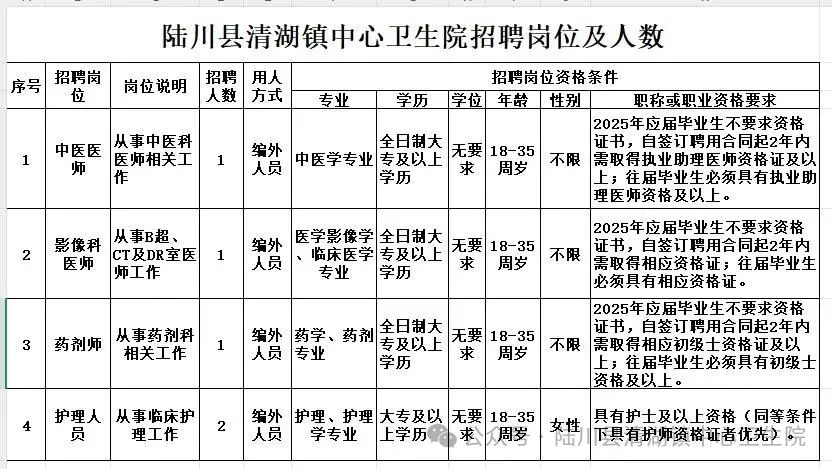 原文標題:陸川縣清湖鎮中心衛生院發布公開招聘編外人員公告
