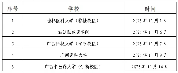 采取現場報名方式的人員請前往桂林醫科大學、右江民族醫學院、廣西科技大學、廣西醫科大學、廣西中醫藥大學等區內各院校雙選會現場進行應聘。廣西區內各院校雙選會舉辦時間詳見下表。