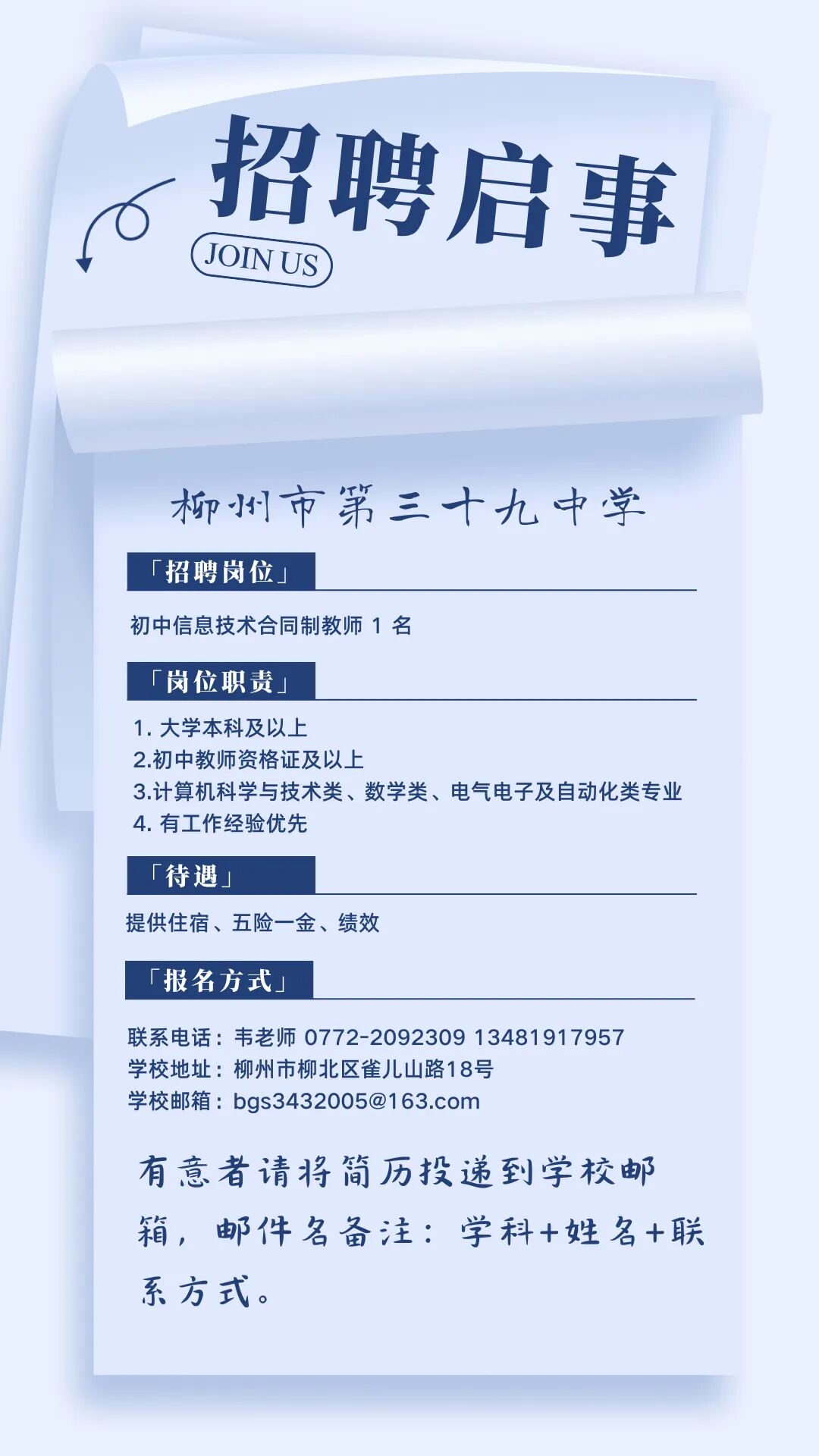 原文標題:柳州市第三十九中學招聘初中信息技術合同制教師1名!