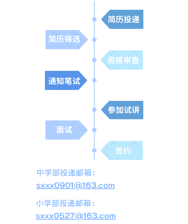 請將個人簡歷(Word或PDF版本)、一張個人生活照以電子郵件附件形式發送至報名崗位對應的郵箱(如有作品,請將作品集一起發送到報名郵箱),郵件主題和附件文件名請備注:應聘學科+姓名+畢業學校。