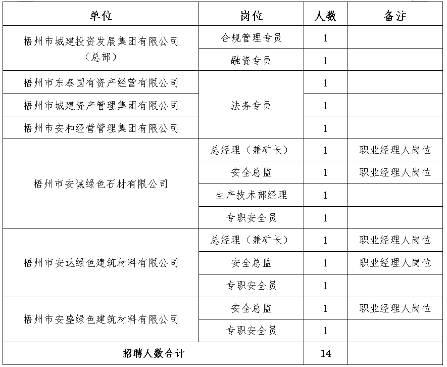 崗位要求詳見《梧州市城投集團招聘計劃表》(附件1)。