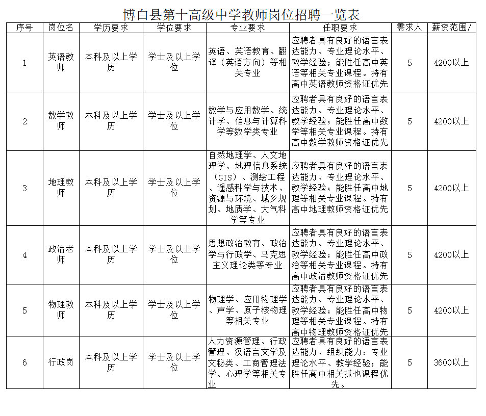 教師崗位需求一欄表