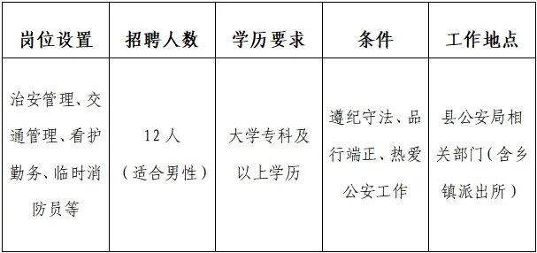 此次招聘的輔警屬勞動合同用工性質,由扶綏縣公安局統一招聘,安排在縣公安局相關部門(具體職位安排如下)。