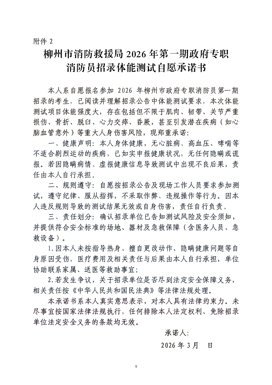 考生在體能測(cè)評(píng)前需簽署體能柳州市政府專職消防員第一期招錄體能測(cè)試承諾書,拒絕簽署的不予進(jìn)行考核詳見(附件2)。
