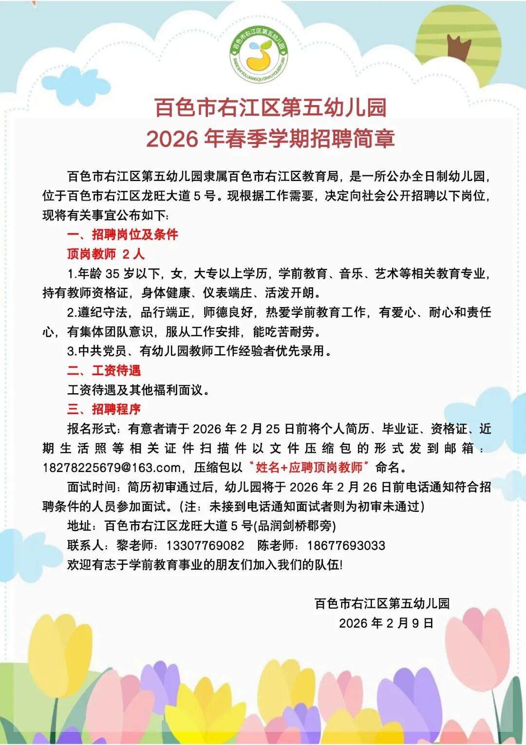 2026年春季學期百色市右江區第五幼兒園招聘2人