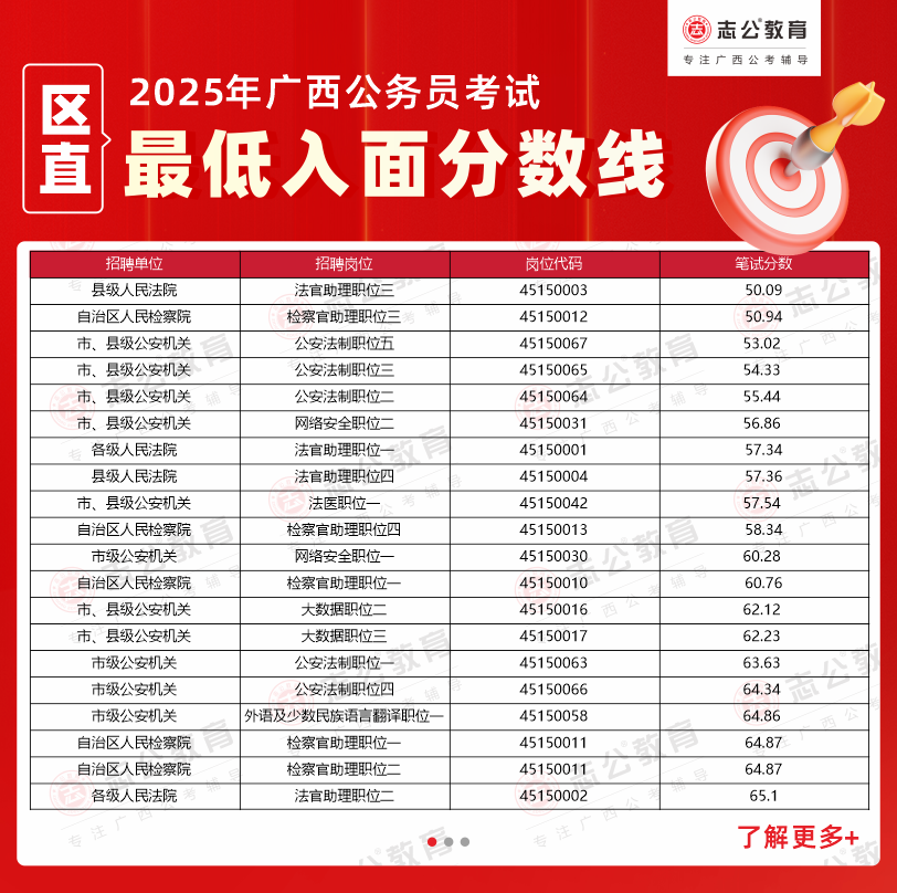 溫馨提示: 以上數據均整理自官方發布的面試資格審查公告,僅供考生參考。2025年廣西公務員考試面試入圍名單及具體分數線以廣西人事考試網及各招錄單位官方通知為準。如需查詢更多2025廣西區考進面分數、不同系統的區直單位分數線,或獲取完整的廣西公務員面試名單,歡迎持續關注志公教育的后續更新。我們將及時為您整理官方信息,助您全面了解考情,科學備考。