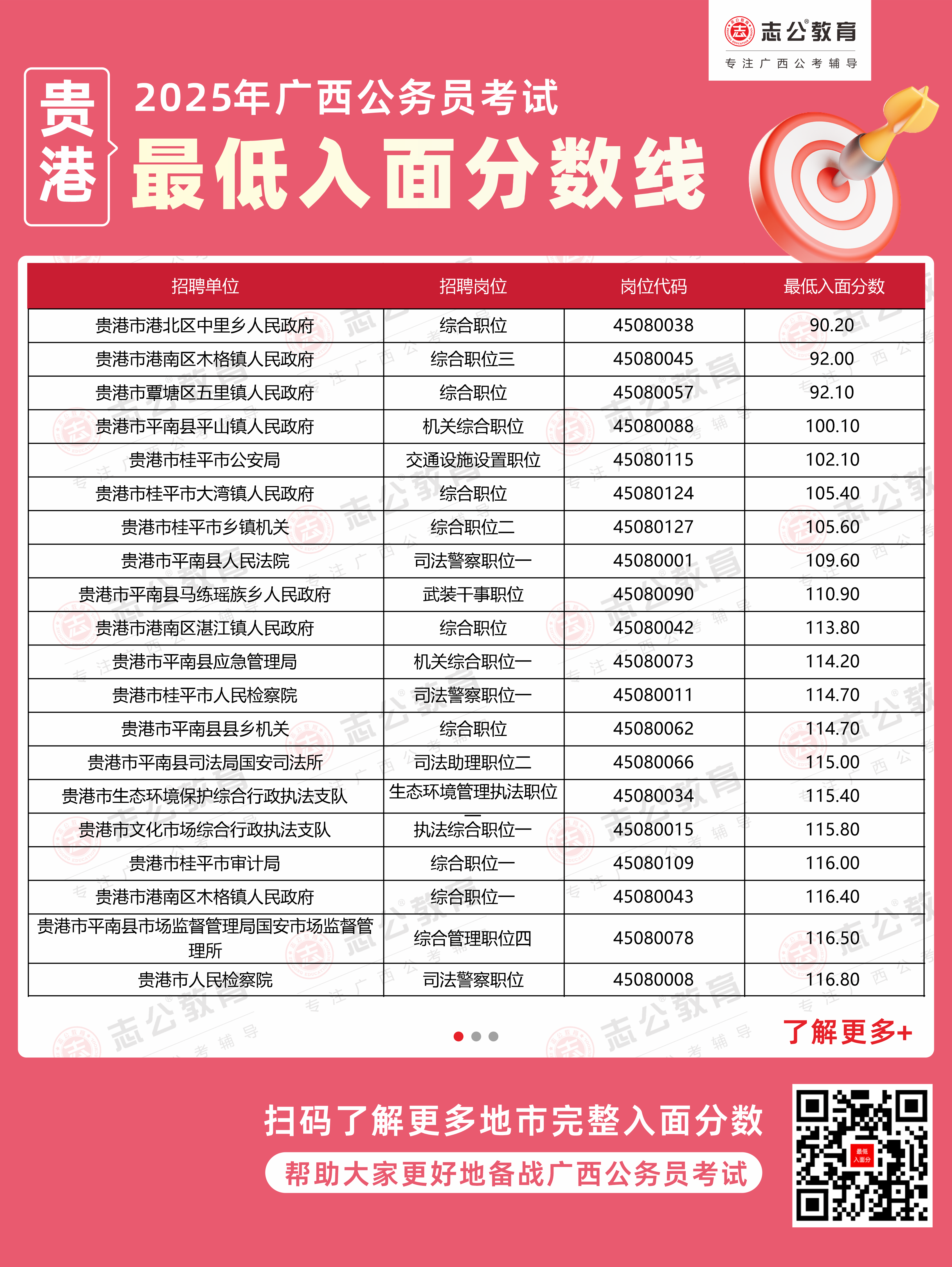 以下為志公教育根據官方發布的面試資格審查公告及公開數據整理的貴港市部分單位的進面最低筆試分數(含照顧加分),數據僅供參考,具體以官方實際公布為準。