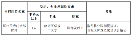 根據醫院發展需要,現面向社會招聘醫療美容門診部醫師,有關招聘事項公告如下: