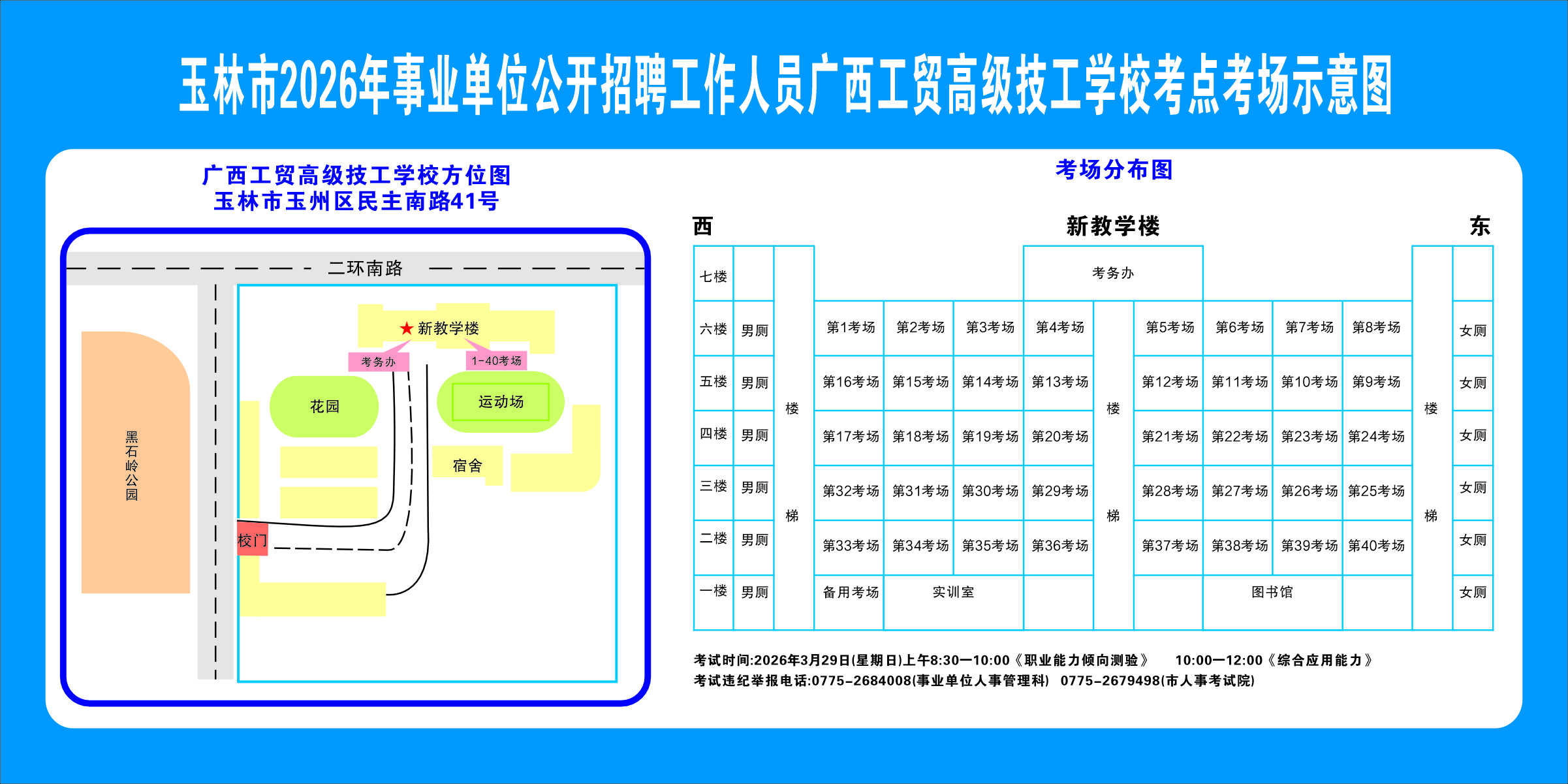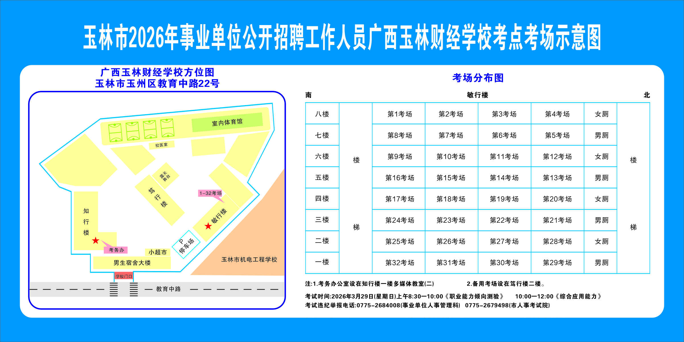 2.需要特別注意的是:玉林市第一職業中等專業學校考點是設在該校的東校區(人民東路東235號);玉林市第一中學考點分為運嶺路校區(二環北路1228號)、大北路校區(大北路453號)。
